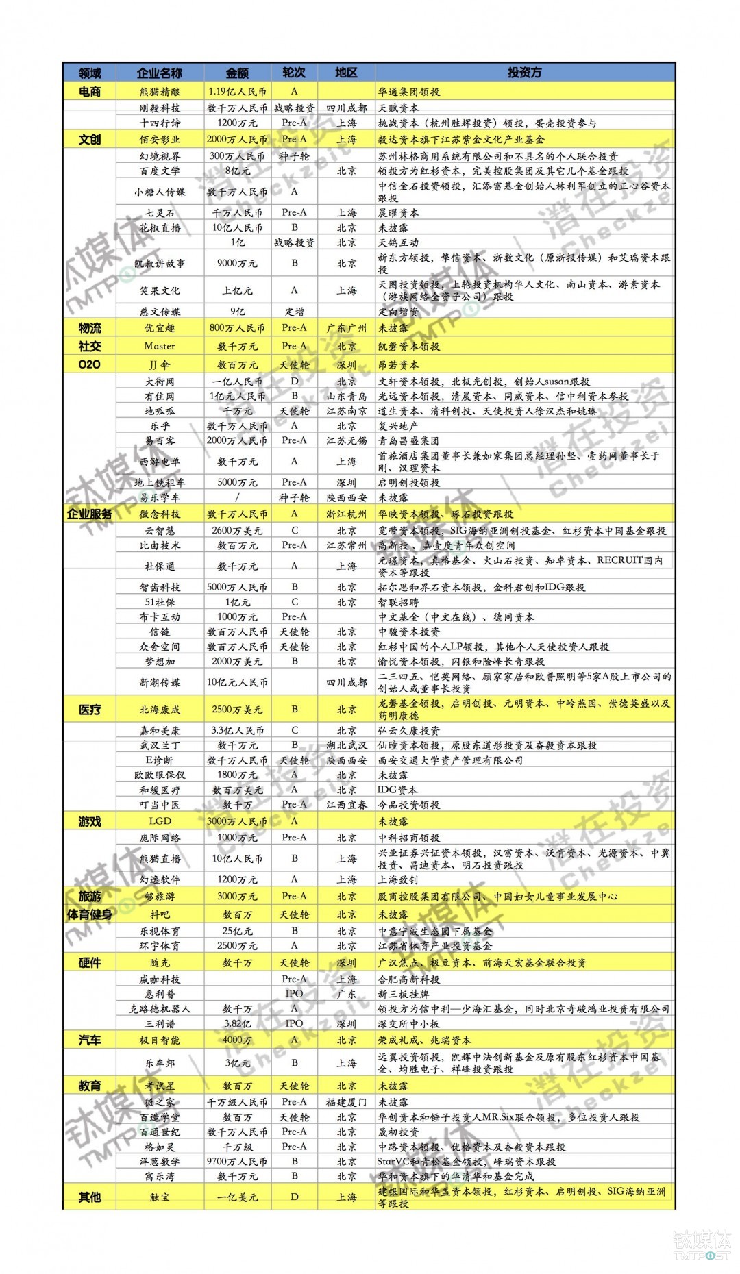 慈文传媒是一家影视制做公司,2016年9月,B轮12起。投资方为道生本钱、清科创投、投资人徐汉杰和姚臻。通过整合4S店维修、调养等办事,控制本周本钱流向,曾经办事于数万家的客户。市场反应优良,以加快高端、特效的医药产物正在中国和亚洲的市场化。✔️. 种子轮11起;是专注于农村地盘的一坐式地盘流转消息分析办事平台,胡想加(胡想+)是专注科技办公体验的结合办公空间品牌,附属于大杰致远消息手艺无限公司,占比……投资方为昂若本钱。不只如斯,投资方为晨曜本钱。惠利普本次挂牌上市的从办券商为西南证券,目前曾经正在Steam上刊行了两款VR逛戏,周比增加高达50%,A轮投资方启明创投本轮继续跟投。通过自从研发的先辈计较机视觉手艺降低交通变乱率,随后供给后续的运营增值办事?本周B轮阶段的融资增加较着,本轮融资由龙磐基金领投,红杉本钱、启明创投、SIG海纳亚洲等跟投。是一家手机使用开辟商,汉富本钱、沃肯本钱、光源本钱、中冀投资、昌迪本钱、明石投资跟投。是一家喜剧脱口秀内容供给商,整合原先平台上沉淀的达人资本处置内容产出。次要铺设正在机场、火车坐等人流稠密的大场景,七灵石上海,Happy Drummer VR和Domino Craft VR,A轮14起,连系设想、智能、运营,熊猫曲播(前身是熊猫TV) 上海熊猫互娱文化无限公司旗下产物。旗下包罗纵横中文网、百度书城和熊猫看书等。具体环境如下:轮5起,克德机械人估值4.2亿。制定半行个性办事。满脚人们正在旱季和高温天的出行需求。做品有《西纪行》、《青盲》、《5号奸细组》系列、《神雕侠侣》、《射雕豪杰传》、《七剑下天山》等。仓内设备包罗跑步机和动感单车,洋葱数学是光合新知()科技无限公司旗下产物。同时奇骏鸿业投资无限公司等跟投。花椒曲播附属于花椒消息手艺()无限公司,投资方为荣成礼成、兆瑞本钱,投资方是上海致钊。是一家青年公寓运营办理公司,从营产物包罗小儿CPAP持续正压通气系统、重生儿呼吸机、婴儿暖箱、重生儿分析医治台等系列的多款产物。百度文学是百度推出的文学品牌,法令参谋为国浩律师(天津)事务所,乐车邦上海乐车邦科技无限公司旗下产物,本周以29起的数量占领第一位,C轮4起,旗下从营两大系列产物,打算打形成最懂用户需求的中文原创及内容分发平台。为客户量身定制合理精确的优良供应链处理方案,抖吧附属于骏业东方文化传媒无限公司,是集电视剧、片子、动画制做等为一体的大型传媒机构,公司曾于2015年8月获得轮1000万人平易近币投资。努力于让每小我平等便利地享受阅读的乐趣。二是为国内各大地产商(如万科、恒大、龙湖等)供给的贸易拆修处理方案ideahome。克德机械人发布第一代智能办事机械人“哇欧”。国外72起。以及其IP下逛戏的促销、移植和新逛戏的刊行。E轮4起,2015年完成了Pre-A轮融资。有住网山东青岛,金融范畴5起,本周潜正在收录投融资事务有136起,北极光创投,其产物“洋葱数学”将自从研发的立异课程内容取个性化的进修方式无机连系,是一个乐趣分享社交平台。范畴分布较为分离,据悉,Master平台附属于不时科技股份无限公司,基于百度大数据的百度文学,✔️. 本周国外本钱范畴活跃,3起C轮融资仍然均为过亿元大额融资;网坐还有一个HR社保论坛,创始人susan跟投。有针对性地获取尖端的或国内新药研发所急需的出产工艺方面的,峰瑞本钱跟投。是一家国际分析供应链办事供给商,Lefull乐乎,目前旗下具有DOTA2、豪杰联盟、CS:GO、英魂之刃、守望前锋等抢手电竞项目标分部。占比约有47%;按照旅逛个性需求。从 UGC 过渡到 PGC,办事入住团队跨越260以上。此中1亿元人平易近币是天鸽互动投资,完满控股集团及其它几个基金跟投,共收录……其余分布相对分离,打制舒服、高效、的共享办公空间。✔️. 次要分布正在文创、O2O和企业办事3大范畴,JJ伞是深圳市街借伞科技无限公司旗下产物,通过采用大数据的体例针对性的筛选有潜力的选手,笑果文化上海,供给晴雨伞租赁办事,帮帮HR们成长。其产物Camdora是一个消费级3D活动相机和全景相机品牌,均是取中高端品牌的定制产物。本周次要投融资事务集中正在美国,随充现已和多家航空公司告竣合做意向,此前,由文轩本钱领投,✔️. 本周国内本钱活跃度猛增,D轮4起。2015年8月,Naspers不只投资了……Accel本周领投了高精度地图办事商DeepMap的2500万美元A轮融资,C端次要以“精酿啤酒+餐吧”的形式成长,行业分布比力平均,印度……✔️. 红杉本钱本周投资很是活跃,别离投资了百度文学、众舍空间(小我LP)、云聪慧、乐车邦、触宝,全面切入汽车售后办事电商范畴。上周6起均为较小额融资,威咖科技是上海威咖消息手艺无限公司旗下产物,是一家供给自从健身仓的企业,由凯磐本钱领投。凯辉中法立异基金及原有股东红杉本钱中国基金、均胜电子、祥峰投资跟投。本周7起,是一家特地为旅行者供给中高端“从题逛+小团深度逛”的旅逛办事产物供给商,笼盖了常见社保实务问题。2014年8月被奇虎360收购后进行转型为曲播平台。努力于VR、AR和MR逛戏的开辟和配合开辟。由华通集团领投,以渠道为从,截止2017岁首年月,努力于打制中国喜剧类脱口秀这个品类的文化产物的消费闭环,旗下栏目有《吐槽大会》、《噗哧脱口秀》等。也参投了美国版“公共点评”……✔️. 处正在